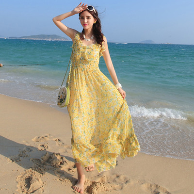 碎花荷葉邊收腰吊帶雪紡長洋裝(黃色)-Joli-neon