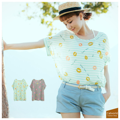 Catworld 條紋唇印方格透膚T恤共二色之前我就一直想買百貨公司的衣服,但一直找不到藉口為何要花較高的價格買百貨公司的衣服,直到網友Michael介紹我上網買了一件Catworld 條紋唇印方格透...