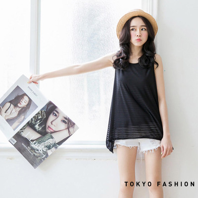 東京著衣 純色透膚條紋傘狀長背心(共三色)