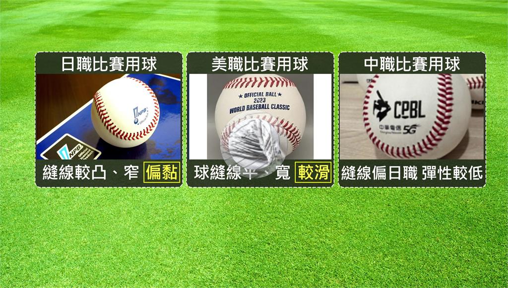 攤開各國用球比一比,由於經典賽採用的是美職大聯盟比賽用球,縫線較平、寬且較滑,而日職比賽用球縫線則較凸、窄且偏黏;中職比賽用球縫線偏向日職,不過彈性較低。