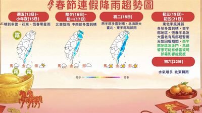 春節連假各地降雨情況。(圖/氣象署提供)春節9天連假即將到來,氣象署今(13)日舉行記者會說明連假天氣,年前至小年夜各地回溫至22至28度,西半部多雲到晴,花東及恆春半島有零星降雨;除夕鋒面通過、東北季風南下,北部及東半部轉為陰雨,氣溫下降2至6度,初一至初二中南部低溫約16度、日夜溫差大;初三至初五東北季風減弱、氣溫逐日回升,西半部多雲到晴,東半部及大台北局部降雨,初六水氣再增,北部及東半部降雨機率提高。