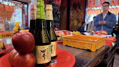從101登頂拜鳳梨到供桌搭配,台灣人把務實與幽默感,也一起拜進生活裡!實際走訪松山霞海城隍廟發現,供桌上的搭配常讓人忍不住多看一眼。除了常見水果,也有些乍看不明白,但一想就懂的組合。像是近期被香客討論的「四季醬油+蘋果」,兩樣日用品擺在一起,正好等於「四季平安」,是一句祝福,也帶點幽默諧音梗。不少香客看到這樣的搭配會露出「懂了」的微笑。有人說:「這樣拜,很台。補財庫三司財庫官廟」有人則表示:「又學到一招,下次也來拜!」對台灣人來說,這是一種恭敬但不失幽默的祈福方式。