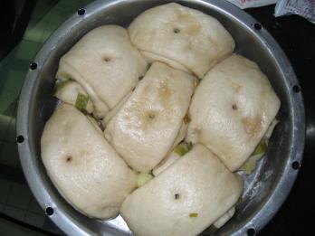 5.用面棍,桿成長方片狀....將胡麻油塗在面片上,再將調味後的葱花舖在面片上,將面片捲起...切段...再花捲上用筷子弄成一小痕,即可放在蒸籠上了,但,需先蓋乾布或蓋鍋蓋,讓花捲面團先醒三分鐘左右(一定要醒面,不然,就算面有發,花捲也會失敗)