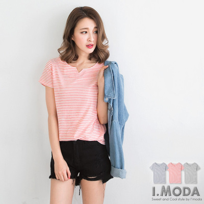服裝推薦OB嚴選-0430新品 人氣必備~簡約亮色小V領細條紋T恤.3色