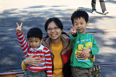 〔小人兒合照,但小毅卻說怕怕,媽媽我只好抱著他〕