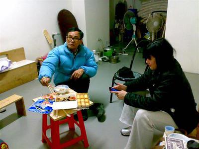 大家很隨意的把椅子擺開,又用一小塊木板當做桌面