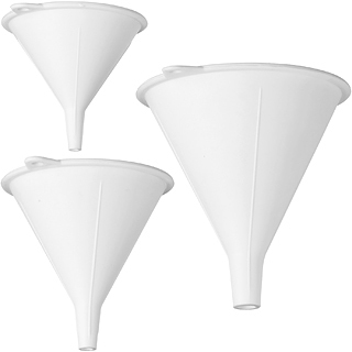 本商品一組大小 3 件入(無濾孔設計)、適合手洗清潔;耐高溫 90 度C。在分裝米綠豆等五穀雜糧、幫寶寶的副食品裝罐、裝填調味料或胡椒粉入罐、或是將榨好的柳丁汁裝瓶外出攜帶,您都可以藉由漏斗的輔助,讓食材不會掉出外漏,使用更方便。不論顆粒、粉狀、液狀皆適合。
