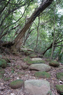 三聖宮廣場前的展望,從上次來爬飛龍步道時,便已知其美。它的美,來自水田,來自恬靜,來自山,來自水...當時我就在想:「爸媽應該要過來看看的。」趁著此次的出門掃黴踏青之旅,我帶他們來到此地,邊看著田園風光,邊乘涼。希冀讓鬱悶已久的心,得以舒展,得以重新看待這世界與我們的人生。老爸老媽在乘涼,我則到處走著,有點靜不下來的感覺。老媽看著我走來走去,自己也跟著走,然後她忽然提議:「我們來走飛龍步道另一入口好嗎?走走看,若不好走,就原路下來。」我當然是好啊!只是有點沒做好心理準備,爬山用具也沒準備好,幸好大部份的東西都在車上,於是先回車上,重新整裝後,再出發! 我們打算走的路線是從羅漢坡走至稜線,稜線至龍尾公園,再從登山棧道一路走下至崇聖亭。很有以前曾經走過,但這段記憶我已經忘了,所以也不知一趟O形走下來要花多少時間。不過,目前時間充裕,應該可以順利走完。 前次走崇聖亭旁的登山棧道走飛龍步道,這次走傳統的登山路線。它的入口就在石碑後方不遠處,停車場旁。 13:44 登山口 H90m入口旁有指標指引,循指標前進。 走沒多久,即見前方似有“阻礙物”。 再走近前一瞧!哇,是坍方、是走山!步道還健在嗎?不死心的我,繼續往上攀爬,探探是否仍有路可走,若無,便作罷!折返回去。 似乎還有路可走,於是招呼老媽說:「有路!可續行!」 於是,老媽也跟著走過來... 雖有路,卻不像是我印象中的步道...山友網誌上的記錄都是有大塊鵝卵石啊!怎麼這裡沒有瞧見呢? 而且,受到之前連兩週梅雨的洗禮,路況不是頂好。 幸好路跡仍明顯,仍可順利的向前進。 13:53 鵝卵石步道 H150m巨大的鵝卵石總算出現在我們眼前。 緊接著而來的,即為陡上的路徑! 陡歸陡,比起剛才所走的路,這裡的步道乾燥許多、“乾淨”許多,走來雖累、雖喘,卻走的安心、舒服。 地勢漸漸趨緩,似快要走上了稜線了。 今日天氣,太陽未常常露臉,偶有涼風吹拂,讓汗水不致狂噴。 14:00 岔路,取右。H170m 路徑仍有碎石,仍緩上,還未至稜線。 14:03 岔路,取右,往龍尾運動公園。H190m 走至稜線了!可以輕鬆走了! 走著走著,心裡開始冒出一個疑問:「和前次走的路,似有出路...沒印象曾經走過這裡耶!」 真的是沒有!究竟我們現在走的步道,距離500障礙訓練場還有多遠呢? 14:17 圍牆 H204m這...有印象,但相對位置怪怪的。若真是前次的那道牆,距離公園頗遠啊! 順著圍牆旁的路徑往前進... 偶而露出的風景,稍稍緩和心中的不安。 14:26 岔路,取右。H198m 開始有些熟悉了... 14:29 500公尺障礙訓練區 H195m不過,光走的這裡,已經花了不少時間!與我事前的估計,差距頗多!看來“印象”不能當飯吃,得更精確去評估事情才行,否則一旦錯估情勢,後果可不堪設想。 目前的感覺就是有點錯估情勢,體力與精神消耗頗大。雖走稜線,但愈走愈累。 14:34 龍尾運動公園 H186m總算走到龍尾運動公園了... 14:35 岔路,取右,往三聖宮。H184m在準備往前進前,母親要求多休息一會,她累了...跟我一樣,被那有點過於漫長的稜線之路消耗掉不少體力。我耐心等候著母親,待她休息足夠後,隨即出發啟行。 步道旁的偶露的展望 接下來的路,很熟悉,全都是階梯路。上回走的很累,而今次,一路往下,理應輕鬆。 陡下之路,雖輕鬆,但若距離長又久,還是會累! 尤其是心中期待快點走到出口,可偏偏迎接我們的還是無止盡的階梯路徑時,心中真的挺氣餒的。不過,換個角度去想,前次是往上走,我們竟然順利走完這段陡上之路...真的難以想像啊! 14:48 木橋 H88m終於來到山谷中的木橋了。距離終點,總算是近了。 步道終點前就在前方,其旁的「崇聖亭」便在眼前。 14:52 步道出口 H73m我請老媽在此等候,自行壓馬路往上獨走至登山口前的停車場取車,並與老爸會合。14:55 登山口前停車場 H90m非計畫內的飛龍步道O形走行程,竟在今日以這種方式與心情完成,有點小意外!也有點開心!至少沒白白浪費時間,同時又慶幸路況還算良好,可以平安順利的完走。我想這一切都得感謝老媽的提議與老爸的成全吧!跑步距離我似乎又更遠了些,當我更貼近山林,總會因此而失去了一些東西。遺憾難免,但不後悔。畢竟可以跟家人同行,比什麼都還更加珍貴!而這正是此時此刻的我,最想要、也想要不斷去做的事...趁著大家都還有體力、還能走的時候。軌跡圖 共行走約3K,費時約1小時10分左右。落差圖 行旅時間:2017/06/23 下午 文字記錄:2017/06/25 凌晨