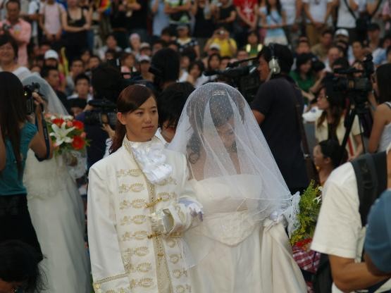 有一中一美的男同情侶,看著隊伍一一前進,他們也從牽手、接吻,