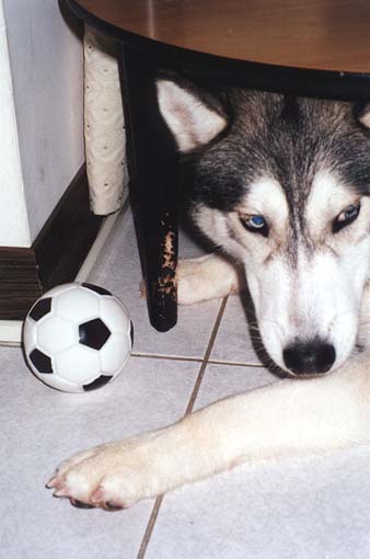p.s.這顆球還不是他最愛咬的,因為比較大顆,不好咬,他最愛的那顆已經連黑色部分都咬白了,呵~~~