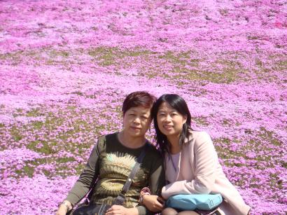 陽光很強,所以拍起照來眉頭很難開展。這是我和媽媽,陽光下我媽的髮色超紅,這次下手重了點。我特地穿上和芝櫻同色系的衣服,哈哈!心機很重。(而且當天北海道的氣溫是九度~十二度左右) 遠方是本團的次級...