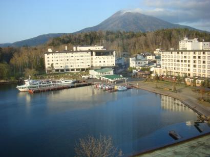 第二天傍晚,我們住在阿寒湖畔的「新阿寒飯店」,旅行社幫我們安排面湖的房間,這是房間裡往右望見的阿寒湖風光。住在阿寒湖的那天是五天中氣溫最低的一天,只有七度~~(抖)但我還是以意志力克服了寒冷。往左望,...