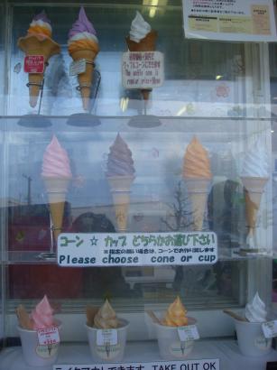 櫥窗裡的冰淇淋模型太吸引人啦~有薰衣草、哈密瓜、牛奶、草莓、巧克力等多種口味本想吃「北海道三段」──哈密瓜、牛奶加薰衣草,可惜薰衣草賣完了,只好吃哈密瓜的有趣的大霜淇淋模型,但我覺得巧克力那個做得有點...