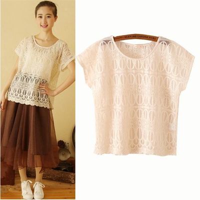 推薦 2015新款服飾-【Moriya日森系 】純色蕾絲簍空寬短袖衫 現+預