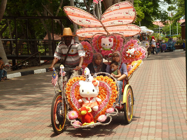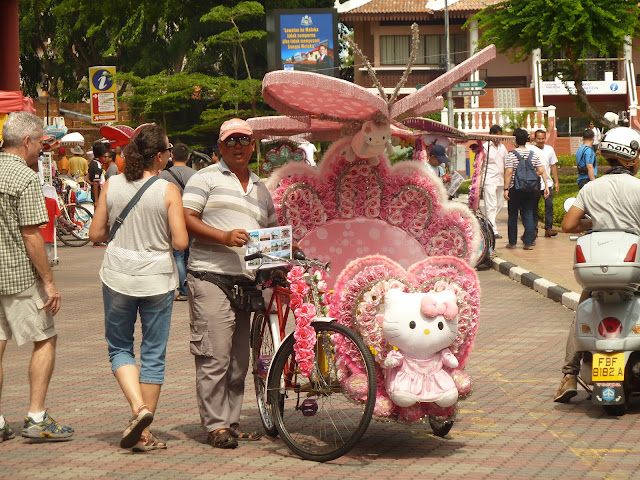 值得一提的是廣場一帶的三輪車,這種三輪車我也曾在仰光見過,不像澳門的車廂在後,而是附設在車的左側,我在仰光見到時,那三輪車作為一種公共交通工具,混雜在馬路其它汽車之中,同車唔同命,在馬六甲,那種三輪車卻成為遊覽工具,經過司機的悉心佈置,變得花枝招展,因此不叫三輪車,叫「花車」。「花車」的佈置有不同主題,有的是Hello Kitty,有的是《冰雪奇緣》,還要播放音樂,認真有趣。