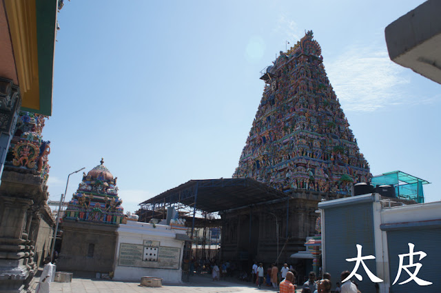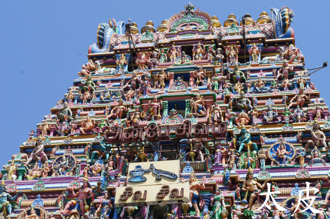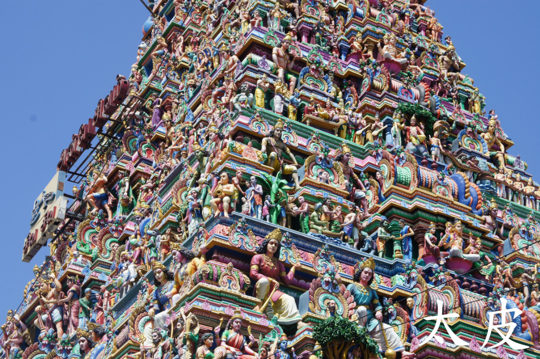 廟宇為達羅毗荼建築風格,在東邊大門有一個南部印度教建築特有的門塔(Gopuram),高達四十米,共有十幾層,每一層都佈滿色彩艷麗的印度教神祇及神話人物塑像,少說上千個,密密麻麻,栩栩如生,令我一下子就被那震撼畫面點了穴道。