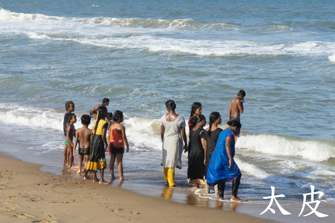 當地人結伴在海灘玩樂,大多和衣下水,或游泳,或互相潑水,嬉笑打鬧;印度人是“顏色控”,那些女性本就穿着五顏六色的傳統服飾紗麗,濕水後更加鮮艷,構成一幅妙趣橫生、色彩繽紛的畫面。看到這樣的畫面,再加上她們的笑容和笑聲,我還怎會惱恨呢?我嘴角上揚了,真想多留一些時間啊!