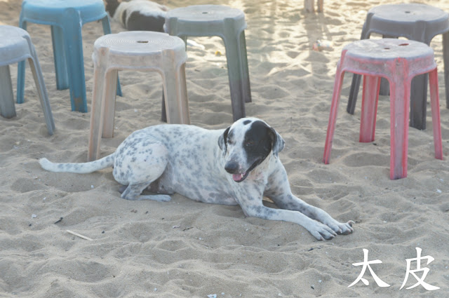 教堂旁邊就是遊艇碼頭海灘,海灘全長十三公里,供遊憩的有六公里。除了長,也很闊,由大路走向海邊,只見沙上有不少垃圾乃至糞便,越近海則越乾淨。近海處散佈着一些小販攤子,還有大量閒置的舢舨,舢舨旁有漁網,估計是捕魚船吧,不少遊人躲於船邊陰影處抵擋太陽。