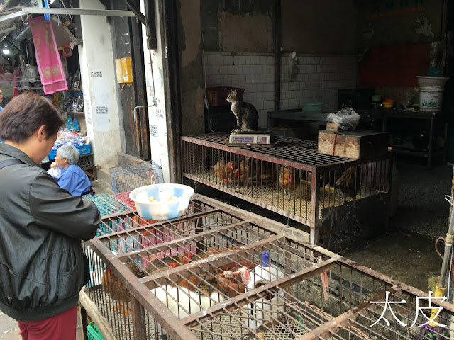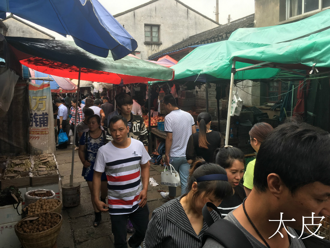 那較重旅遊味的一段過後,從一條大馬路底下穿過,山塘街像突然脫下貴家小姐的偽裝,搖身一變成為灰姑娘了,再不是虛情假意的旅遊區,而是延綿幾百米的市集。在屬於旅遊區的部分,我幾乎沒拍一張照片,但在屬於市井之地的部分,我的手機一直拍個不停,甚至對擠迫的遊人也毫不反感。兩邊都是民居或商店,攤子擺滿街上,像接龍一樣一攤接着一攤,並沒有分開不同的類別,蔬果攤緊挨着屠夫的門戶,魚蝦蟹與禽鳥左右相聞,當中還夾雜了一兩家老字號食肆。還有一些奇怪的小檔,例如有老人家用小簍筐裝滿鴿蛋販售,邊上放隻鴿子做生招牌;有人將整個蜂巢切割成不同的大小售賣,又再切出一些小塊供顧客品嘗。
