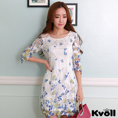 最近在網路上看到 【KVOLL中大尺碼】藍色蕾絲印花拼接連衣裙 覺得價格很實在 深得我心