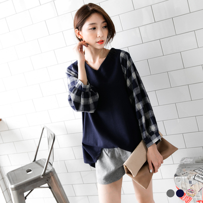 1215新品 質感格紋拼接九分娃娃袖長版上衣.2色 更多詳細的資訊這邊請: