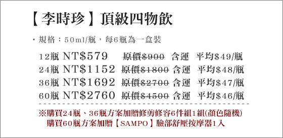 商品訊息簡述: 平均每瓶最低只要46元起(含運)即可享有【李時珍】頂級左奎?2瓶/24瓶/36瓶/60瓶(50ml/瓶,每6瓶為一盒裝);購買24瓶、36瓶方案加贈修剪修容6件組1組(顏色隨機),60瓶方案加贈【SAMPO】臉部舒壓按摩器1入。