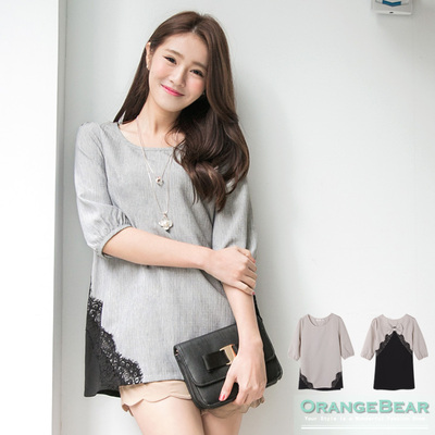 評價 1007新品 甜美風尚~雙色質感面料拼蕾絲蝴蝶結造型長版上衣.2色