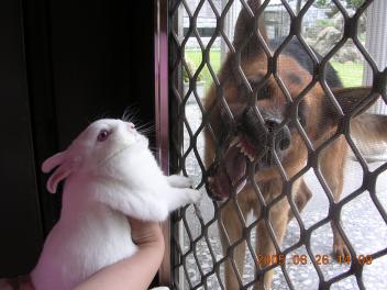 這天請坤興把阿賣帶下來可惜力誠去兵役體檢~沒有一塊來玩兔子我的愛兔在桌子上玩得正開心突然一個粉紅色籠子出現牠戰戰兢兢地靠近聞.....並且立刻跳開阿賣則是一直不出來~搞個老半天...終於兩隻相見歡可是...