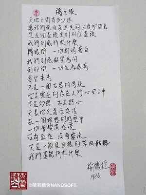 文/蘭若精舍.柳藏經 天地之間有多少悲 讓我們喋血在迷失的三度空間裏 從這個盡頭走到那個盡頭 我們到底祈求什麼 轉眼間 一切都將蒼白 我們到底癡望為何 剎那間 一切化為虛有 寄...