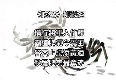 文/蘭若精舍.柳藏經 橫行將軍入竹籠, 霸道脾氣今受困; 饕客上桌添黃酒, 秋蟹肥美最奪魂。 (柳藏經于蘭若精舍2016/9/17) ⭕️上聯:橫行將軍,在此束手就擒。下聯:清...