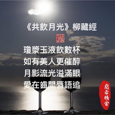 文/蘭若精舍.柳藏經 瓊漿玉液飲數杯, 如有美人更催醉; 月影流光溢滿眼, 愛在齒間唇語追。 (柳藏經于蘭若精舍2020/12/6)