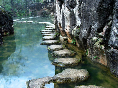 蜿蜒石塊當步橋,清風盈盈水面搖;水色倒映碧雲天,世外桃源誰知曉。