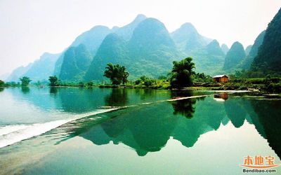 桂林山水多美景,水面如鏡風輕盈;一舟渡江有痕跡,一幢木屋映倒影。