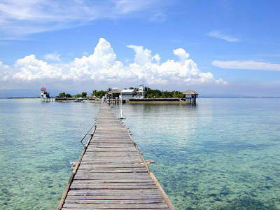 藍天白雲好風光,民宿建在海中央;四面環海景觀遠,一線棧道迎十方