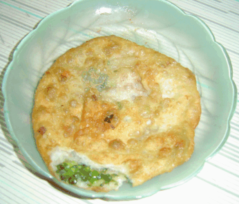 這家店的店面很小,中年的老闆負責煎,後面兩位一男一女負責原料製作,前面則由一位中午歐巴桑(她穿著深紫色的小可愛吊嗄……)負責招呼客人。其實這攤子看起來實在很不衛生,使用的是看起來常年黑黝黝的油鍋,裡面則是煎炸著各種滾燙的餅,看起來就是很油膩絕對會發胖的食物,但是看見這麼爭相排隊,我想我就試看看。最後我買了一個葱油餅、兩個蛋餅及兩份蘿蔔絲餅,豆沙我猜想都是甜的,所以我就沒有買。
