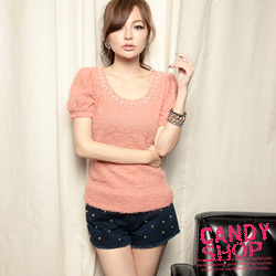 【candy小舖】公主氣息圓領綴珍珠X水鑽毛茸短袖上衣-棉花粉 沉醉於秋冬的深刻氛圍 毛茸茸的布料加強供氣息 小包袖的甜心設計款多了珍珠的點綴變的奢華氣質