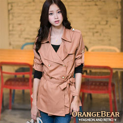 【OrangeBear】翻領雙排釦綁帶縮腰長版風衣外套 具知性感的雙排釦設計,