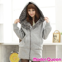 【Model Queen】長版花豹紋連帽刷毛外套-淺灰