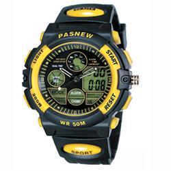 PASNEW 火紅多功能雙顯電子行針錶-黃/42mm
