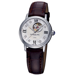 Raymond Weil 蕾蒙威 經典大師(Maestro Lady)女錶 經典大師女士腕錶於12點位置的透視窗,可一窺機械表運作的動感美;精鋼表殼的優雅曲線,搭配珍珠貝母的面盤,詮釋出該系列腕錶的典雅、時尚氣質,襯托出手腕的細緻。