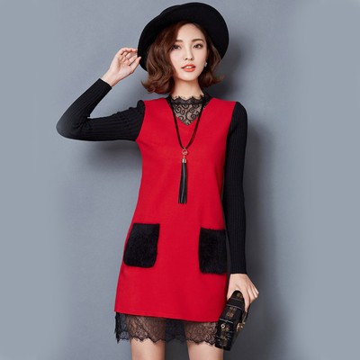 快看!我最近買的韓國空運【現貨 GAZE】蕾絲拼接撞色毛呢針織洋裝 送項鍊(紅色 752917)介紹比較mobile0