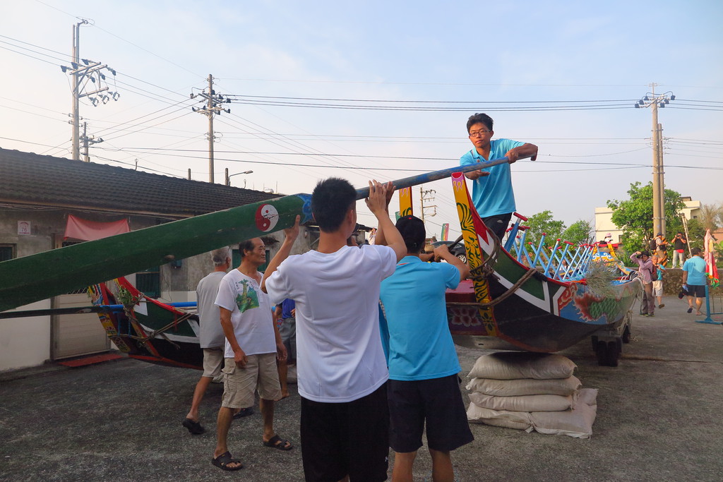 龍船平時置放在「龍船厝」,競渡當天兩庄村民會把各自的龍船請出,我在清晨五點多時來到淇武蘭庄停放龍船的三合院老宅,兩艘龍船已置放在宅院前的晒穀場,全庄老老少少的居民一起陸續著手縛龍骨、繫繩、架舵、插旗等準備工作後,還必須進行「淨香」儀式,待吉時一到全村村民聚集焚香祭禱,才會合力將龍船抬下河道。