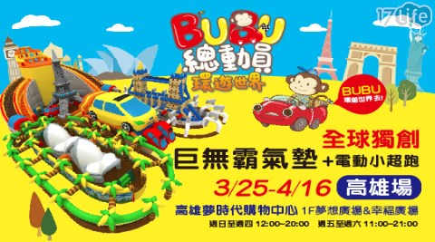 BuBu總動員巨無霸氣墊展《高雄場》-早鳥預購專案|展《高雄場》】原價最高700元早鳥預購專案:(A)家長陪同進入氣墊遊戲乙張(B)兒童入場券乙張+贈電動小超跑體驗券乙張/(C)兒童單人入場券(含贈電動小超跑體驗券)乙張+家長單人陪同券乙張/(D)氣墊遊戲券二張+贈電動小超跑體驗券二張。