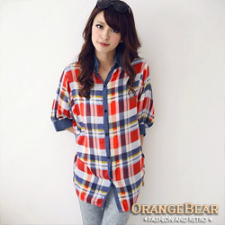 【OrangeBear】飛鼠袖拼接丹寧亮彩格紋襯衫‧共二色