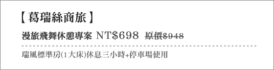 「休息,是為了走更長遠的路。」 來到【葛瑞絲商旅】,映入眼簾的大片棕色與橄欖綠,營造知性優雅的感受。在這裡,旅人們請盡情享受旅程中的小憩!║ 飯店介紹 ║於今年三月隆重開幕,身處新北市經濟金融與民生娛樂交界點,中和區無論搭捷運或者商務出差至機場,或者自由行的旅客都相當適合,最上等的住宿體驗。║ 房型介紹 ║提供義大利Oliva進口沐浴用品、貼心的生活小物設備,雅致舒適的空間,讓每個旅人都能在此恣意放鬆休憩,享受難得的悠閒。瑞風標準房(一大床)║ 環境介紹 ║新北市首座展示高鐵、捷運、火車的動態模型的人文飯店,模擬行經台灣各地沿途的美景風光,讓你的心跟著葛瑞絲小火車穿越時空框架,展開不一樣的旅程。藝術躍動的空間設計,富有質感的木質氛圍,搭配牆上各式作品,讓生活也能充滿驚喜,優質熱情的服務更讓你流連忘返。提供健身房、商務中心與停車場使用,享受隨時的便利感。║ 周邊景點 ║中和環球購物中心宛若國外的購物中心,其空間充滿時尚感,挑高6.5米,明亮的賣場、流暢的服務動線與結合食衣住行多元品牌,讓消費者能擁有寬敞舒適的購物環境與視野,其中也規劃諸多的親子互動的設施,且其中提供900坪人文公園,讓享受生活及喜好購物的人能與家人和朋友共同樂在其中。