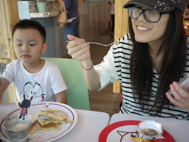 寶寶這天不願意吃蛋糕他一直在等鬆餅,然後就真得坐在一邊默默的等偏偏鬆餅製作比較花時間所以寶寶等很久整個進入不耐煩模式,而且神奇的是吃完之後上車他大概不到五分鐘就睡著了!原來是因為午睡時間到了又想吃又想睡所以很青番~