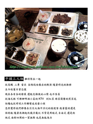 平頭三人組 難得聚在一起從高職 二專 當兵 各階段培養出的默契 隨著時光的推移 至今依舊不曾忘懷現在各有各的發展 還能交換彼此心情 也不容易從海尼根 可樂娜啤酒小菜的KTV 到紅茶 綠茶簡餐的煎茶苑話...