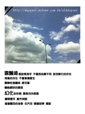 雲飄過風就是推手 不會因為看不見 就忽略它的存在現象的存在 不會單獨產生 關聯性像觸角 牽引著蜘蛛網狀的脈絡 幻化的形態 雲是我我是雲攤開雙手 當作翅膀藉著飄忽的身影 在天空 隨著節奏 擺動