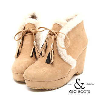 推薦開箱~【0101】馬靴館-韓版雪花厚底臺楔型短筒靴(杏)