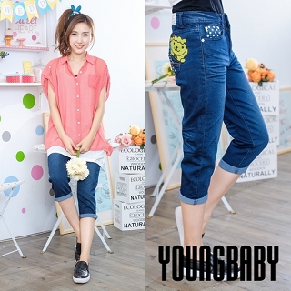 最近在網拍看到【YOUNGBABY中大碼】Lowy點點口袋俏皮小獅牛仔七分褲(藍),